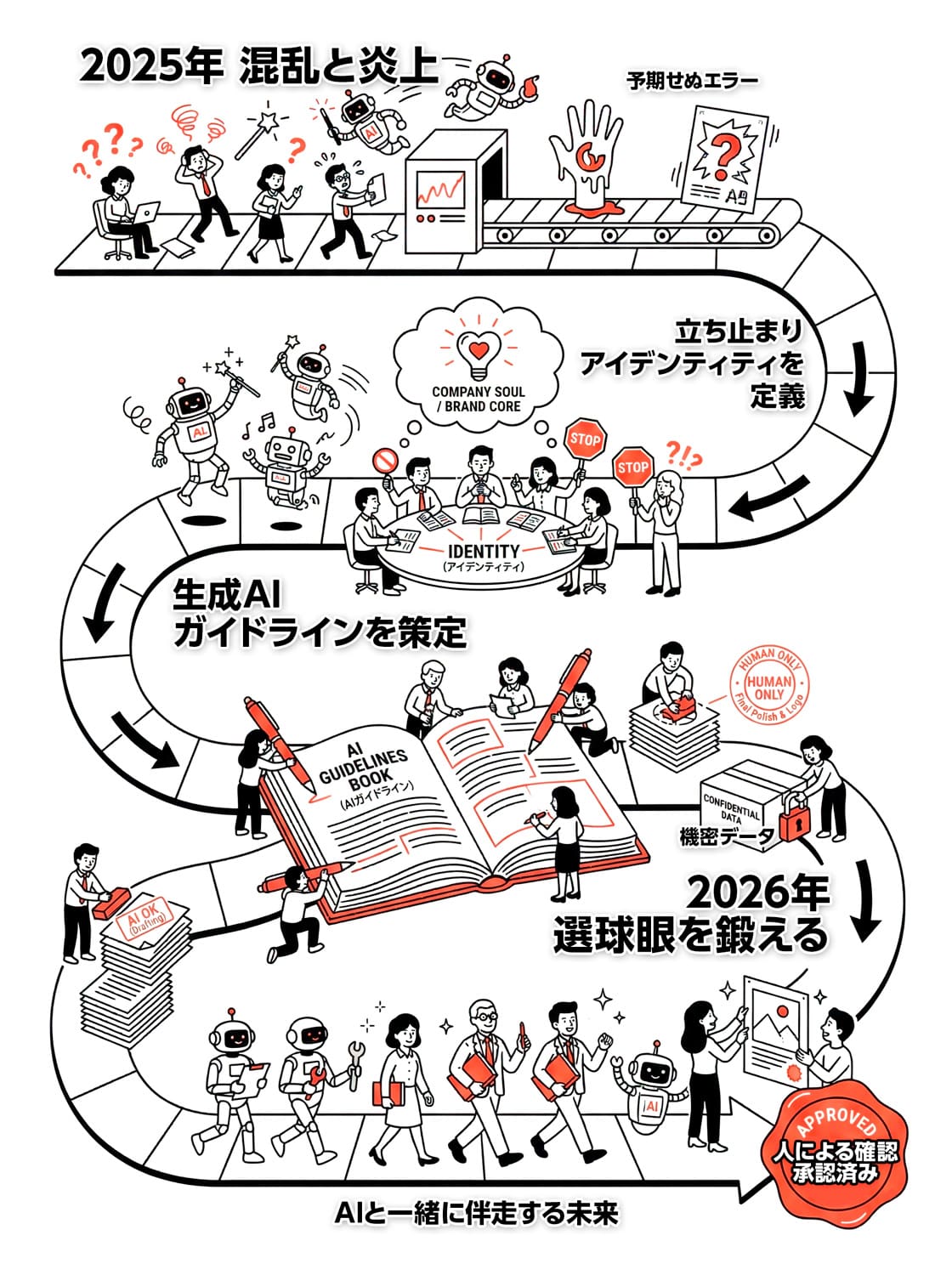 2026年が、皆様の企業にとって「AIに振り回される年」ではなく、確固たる信念を持って「AIを使いこなし、ブランドを磨き上げる年」になることを願っております。もし、そのガイドライン作りや、これからの制作物のあり方に迷われることがあれば、いつでも壁打ち相手としてお声がけください。私たちも皆様と共に考えたいと思っています。