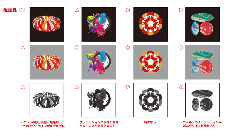 しかし、商業デザインとして活用する際には、使用目的をシビアに考えて行く必要があるという点を踏まえておきたいです。ワンポイントで使うだけなら、どの案も問題ありませんが、さまざまな方式の印刷やグッズ制作となると印刷エラーのリスクやコストを考えなければなりません。