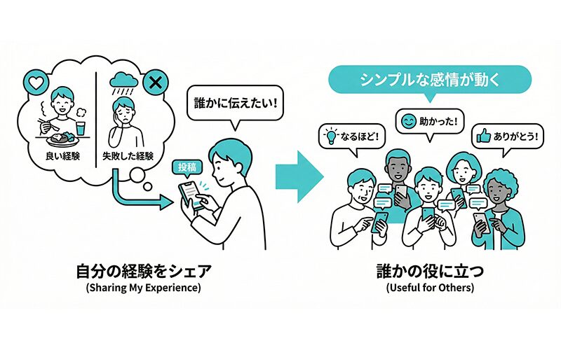自分が良かった経験は見知らぬ誰かとシェアしたい。または、自分が経験した失敗は誰かに伝えて役立てて欲しい。