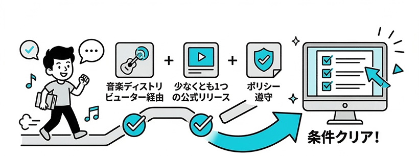 YouTube Musicに楽曲が登録されているアーティストであることが必須。CD Baby・TuneCore・DistroKid などの音楽ディストリビューターを通じて配信する。