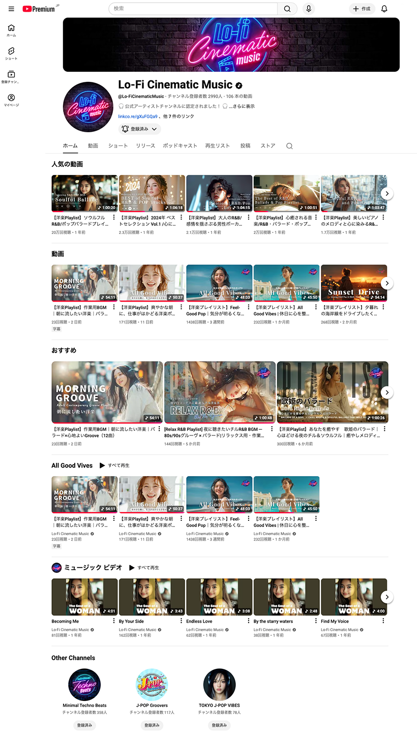 執筆者:後藤ようこ YouTubeAI音楽チャンネルで1ヶ月で1,000人突破!収益化&公式アーティスト認定までの全プロセス 2025年02月18日 ノウハウ <記事の概要> はじめて作ったYouTubeチャンネル。AI音楽チャンネルで1ヶ月で1,000人突破!収益化&公式アーティスト認定までの全プロセスをご紹介します。 目 次 1本ブログをPODCASTで聞く 2AI音楽をYouTubeで発信しようと思った理由 3この記事で得られること(具体的なノウハウと成功の流れ) 4AI音楽チャンネルの立ち上げ(基本設計の重要性) 5使用したツールやAI(音楽生成&編集) 6チャンネルアート&ブランド作り(アイコン・バナー・説明文) 71ヶ月で登録者1,000人達成するための戦略 8ショート動画はAI音楽チャンネルには不向き 9収益化条件クリア&マネタイズ 10公式アーティストチャンネル(OAC)認定の流れ 11【注意】音楽チャンネルの動画を個人のSNSに投稿しないほうがいい 12AI音楽チャンネルを成功させるポイント(まとめ) 1本ブログをPODCASTで聞く スポンサーリンク 2AI音楽をYouTubeで発信しようと思った理由 2024年8月。 弊社はAI生成の音楽チャンネル『Lo-Fi Cinematic Music』を立ち上げました。 AI技術が進化する昨今。 「音楽もAIで作れる」ということに興味を持ちました。 これまで音楽は作曲家やプロデューサーのスキルが必要とされる分野でした。しかし、AIの進化によって誰でも高品質な楽曲を生み出せるようになっています。 特にYouTubeは音楽コンテンツとの相性が良く、視聴者が無料でアクセスできるため、Spotify(スポティファイ)やApple Musicと比べても気軽に楽しめるという利点があります。 さらに、動画と組み合わせることで視覚的なインパクトを与えられるうえ、ショート動画の流行によって短尺の音楽コンテンツが伸びやすい環境が整っていることも魅力の一つです。 音楽チャンネルが“旬”だった 音楽チャンネルを立ち上げたもう一つ大きな理由は、「YouTubeで音楽チャンネルが伸びやすいタイミングだった」こと。特に以下の流れがありました。 ショート動画の普及 : ショート動画経由で音楽がバズりやすい。 YouTubeがSpotify的な使われ方をしている: 作業用BGM・ループ系動画の需要増加。 AI音楽がトレンドになり始めた : 「AI作曲」というテーマ自体が注目されていた。 このタイミングを活かせば、短期間でチャンネルを伸ばせる可能性が高いと判断し参入しました。 YouTubeのアルゴリズムや運営ノウハウを知りたかった 今回の挑戦には、YouTube運営のノウハウを実践的に蓄積したいという目的もありました。 これまでの経験から、YouTubeは「再生回数」よりも「視聴維持率」や「クリック率(CTR)」を重視する傾向があると感じていましたが、実際に 「チャンネルをゼロから立ち上げて、どのように伸びるのか?」 をデータとして記録し、経験値を積みたかったのです。 具体的には、 YouTubeのSEO(タイトル・タグ・説明文の影響) おすすめ動画に乗る条件(アルゴリズムの傾向) ショート動画と長尺動画の違い(登録者増加に与える影響) 収益化までの流れや審査基準のリアルな体験 といった要素を、自分で試しながら学ぶことで、顧客へのサポートとしてのYouTube戦略を提案できるのではないかと考えました。 AI音楽の可能性を探ることに加えて、「YouTubeの仕組みを深く理解する」 というのも大きなモチベーションでした。 目標(登録者1,000人&収益化、公式アーティストチャンネル獲得) このチャンネルを立ち上げるにあたり、まず明確な目標を設定しました。 最初の目標は「1ヶ月で登録者1,000人を達成し、収益化すること」 でした。チャンネルが収益化できるYouTubeパートナープログラム(YPP)に参加するためには、「登録者1,000人+総再生時間4,000時間」または「ショート動画1,000万回再生」の条件をクリアする必要があります。 ➡ YouTubeパートナープログラム(YPP) これらを達成するために、長尺動画とショート動画を組み合わせた戦略で伸ばすことを計画しました。 次の目標は 「YouTube公式アーティストチャンネル(OAC)の認定を受けること」です。 OACを取得すると、検索結果やYouTube Musicとの連携が強化され、公式アーティストとしての信頼性も高まります。そのため、YouTube Musicでの配信方法を取り入れつつ、チャンネルのブランド化を進めること も重要視しました。 ➡YouTube公式アーティストチャンネル(OAC) 3この記事で得られること(具体的なノウハウと成功の流れ) この記事では、AI音楽チャンネルを1ヶ月で成長させ、収益化&公式アーティスト認定を達成した方法を具体的に解説します。 読者が得られること AI音楽チャンネルの立ち上げ方と必要なツール 1ヶ月で登録者1,000人を突破する戦略 収益化の条件や審査の流れ 公式アーティストチャンネル(OAC)取得の手順 AI音楽に興味がある人や、YouTubeで音楽チャンネルを成長させたい人に向けて、実践的なノウハウをまとめておきますので、ぜひ参考にしてください。 4AI音楽チャンネルの立ち上げ(基本設計の重要性) AI音楽チャンネルを成功させるためには、初期の設