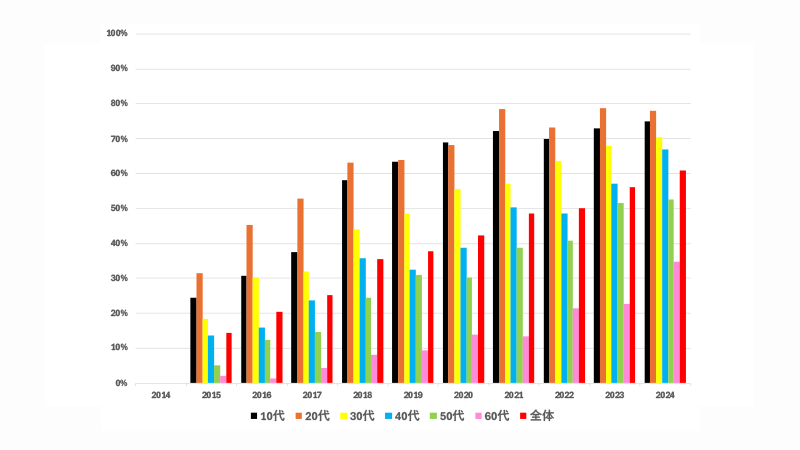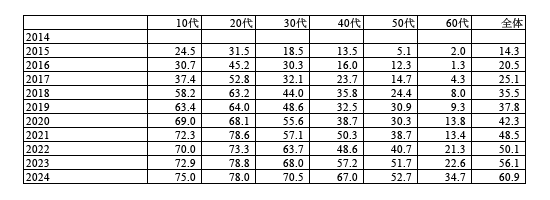 2024年には、20代78.0%、30代70.5%、40代67.0%、50代52.7%と飛躍しています。