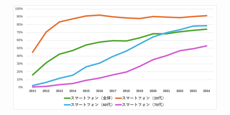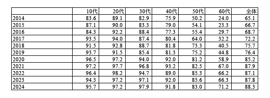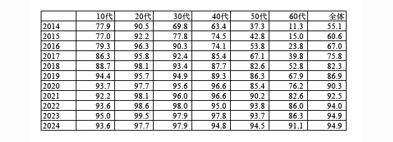 20代は2014年の時点からすでに高く、その後も95〜99%台で推移し、2024年でもは実に97.7%と、早い段階から“生活の前提”として使われ続けている状況です。