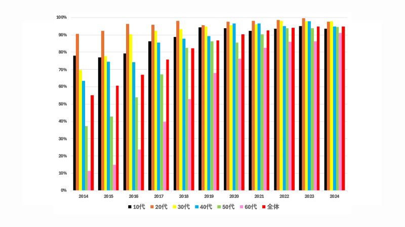 この推移を総括すると、2014〜2018年にかけて30〜50代へ急速に普及が進み、2020年以降は20〜50代が95%前後の高水準に集約していく流れが見えます。
