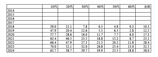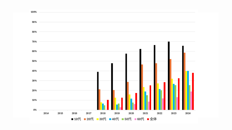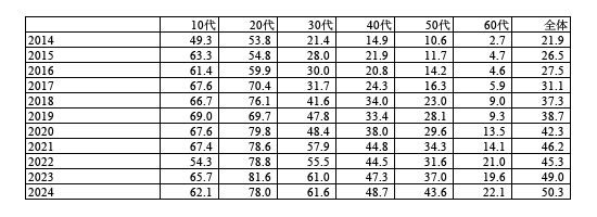 20代は2021以降に一段伸び、2024年は“6割手前”へと達しています。