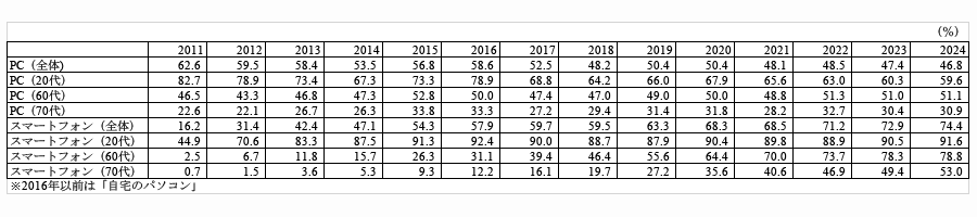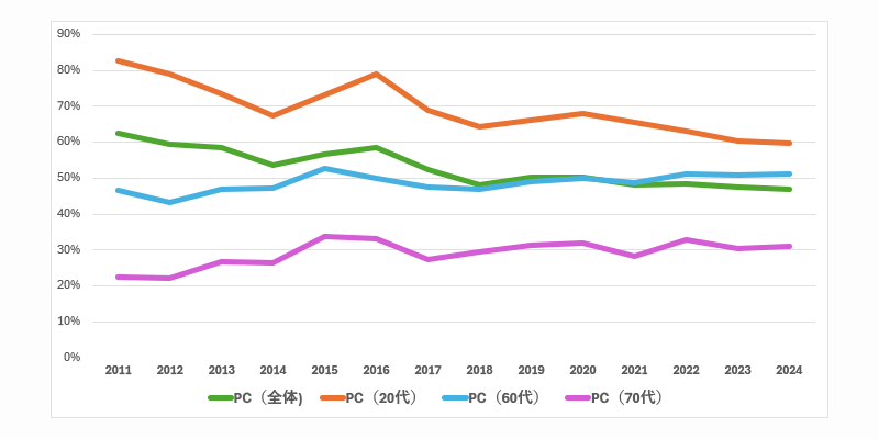 全体的には、2011年では62.6%だったのに対し、2024年では46.8%に下がりました。14年間で15.8ポイント低下しており、パソコンが「主要な接続端末」だった時代から、相対的に比重が小さくなってきたことが読み取れます。