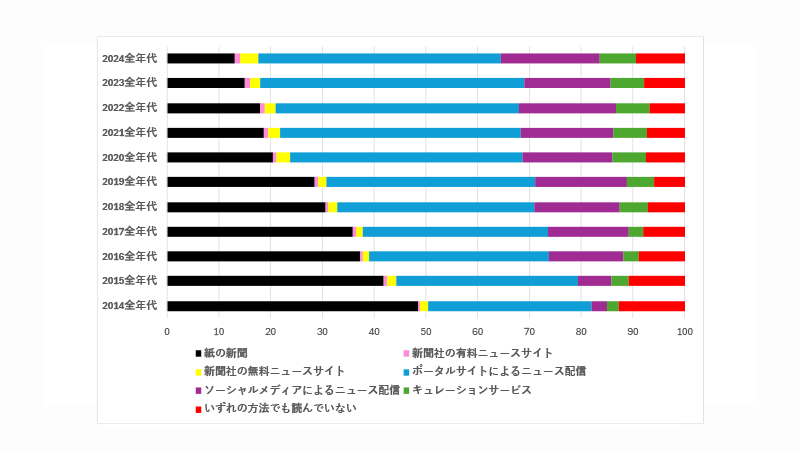 ニュースを「いずれの方法でも読んでいない」層は、2014年*の12.8%から2024年9.5%へやや減少しています。大幅に減ったわけではないため、ニュース接触が薄い層が一定数いる点も前提として残ります。