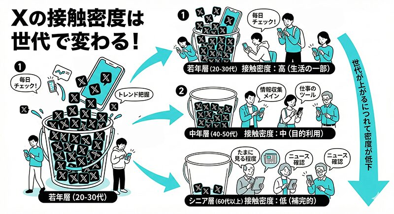 XはLINEのように全年代で同じ水準へ収れんする“連絡インフラ”ではなく、年代によって普及スピードと定着水準が異なるSNSだと分かります。