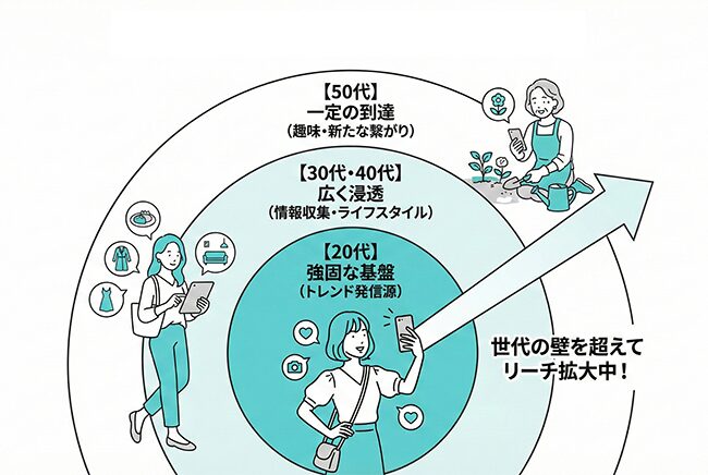 2024年には、20代58.7%、30代39.7%、40代39.9%、50代25.5%と、若年で強く、近年は30〜40代にも拡大中のSNSです。