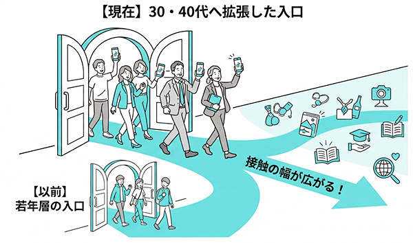 特徴は、YouTubeのような「世代横断の標準メディア」ではなく、若年層で先に普及し、その後に30〜40代へ広がっている点です。年代差は残るものの、近年は40代でも利用が大きく伸びており、分布が変わりつつあります。