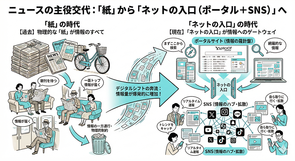 結論から言うと、紙の新聞が急減し、ニュースの中心はポータル(ネット)に移った一方で、ソーシャルメディアやキュレーションも一定の存在感を持つようになっています。