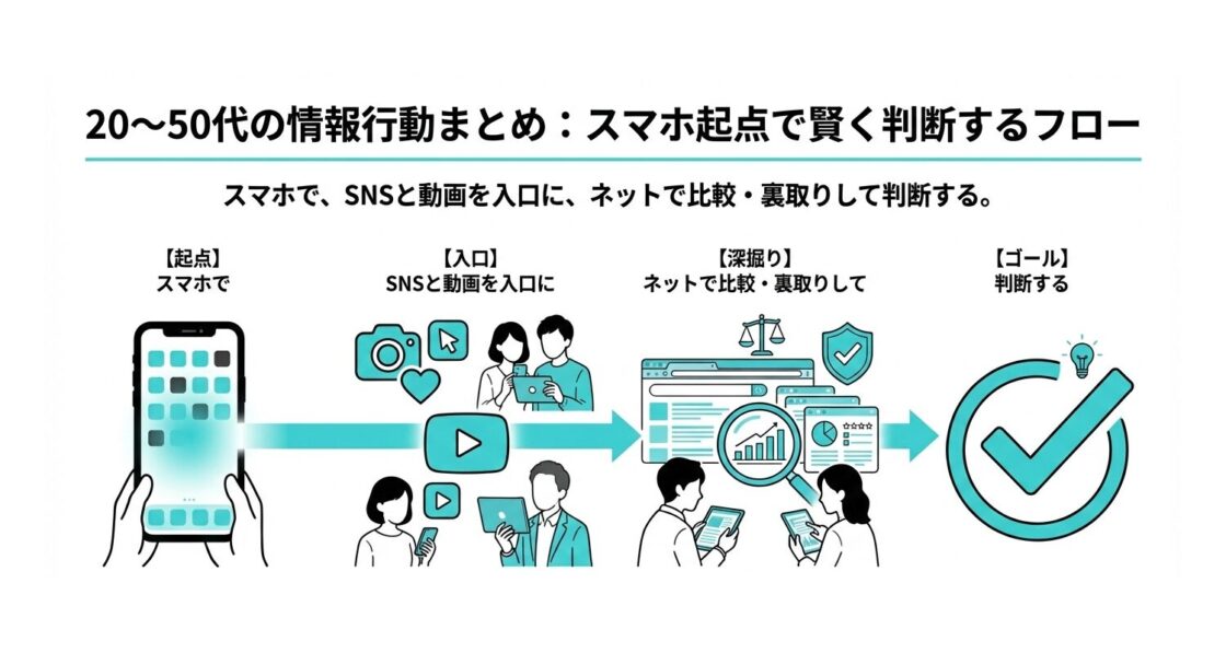 情報通信白書のデータから20〜50代のネット利用実態を8つの視点で整理。スマホ起点でSNS・動画・ニュースを入口に比較検討し、LINEで相談・連絡する前提を踏まえ、中小企業の採用導線の最短設計を提案目 次