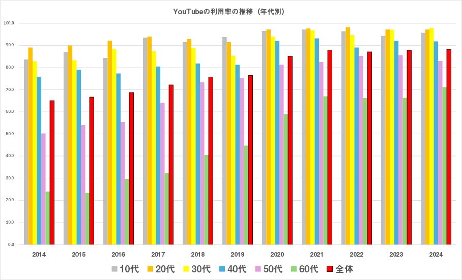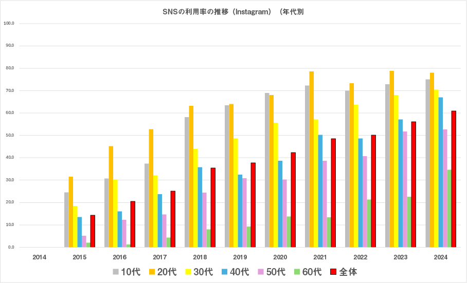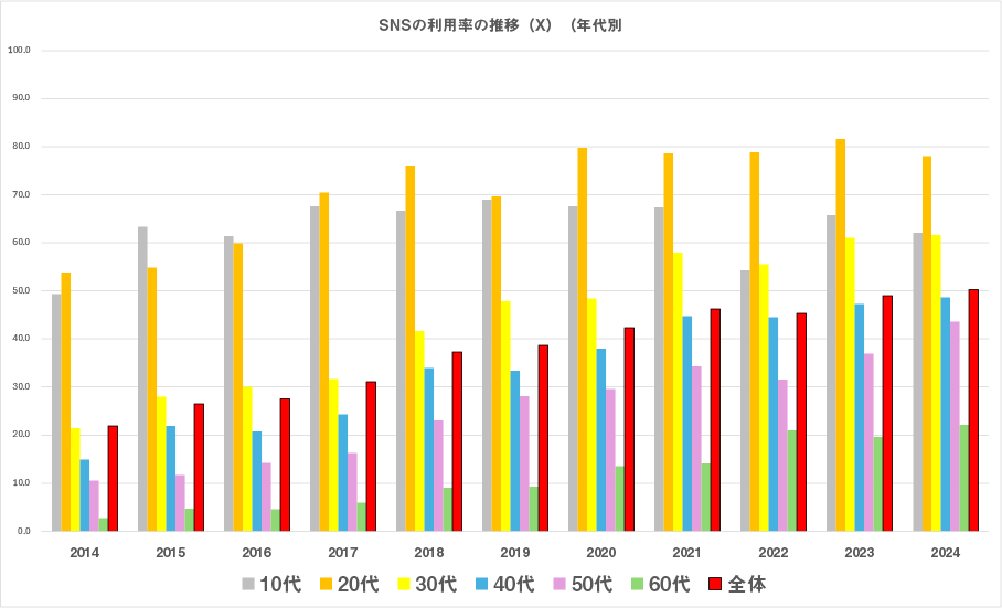 一方、X(旧Twitter)やInstagram も利用者は増えており、若年層を中心に利用率が高いものの、2024年時点では全体の約半数が利用し、50代でも4割以上が使っています。