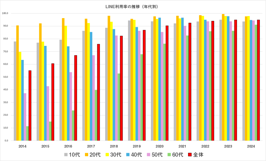 LINEの利用率は、2014年には全体で約55%でしたが、2024年には 約95% まで増加。